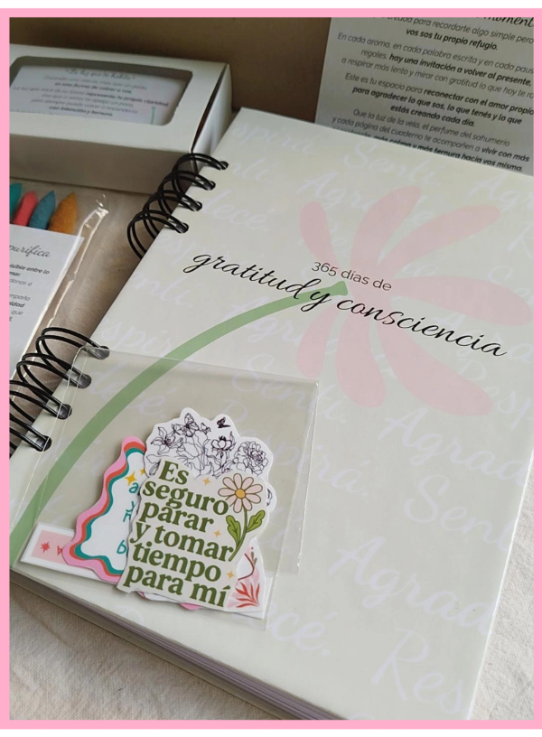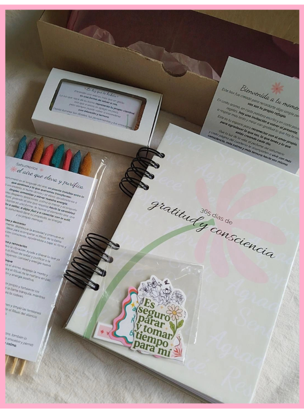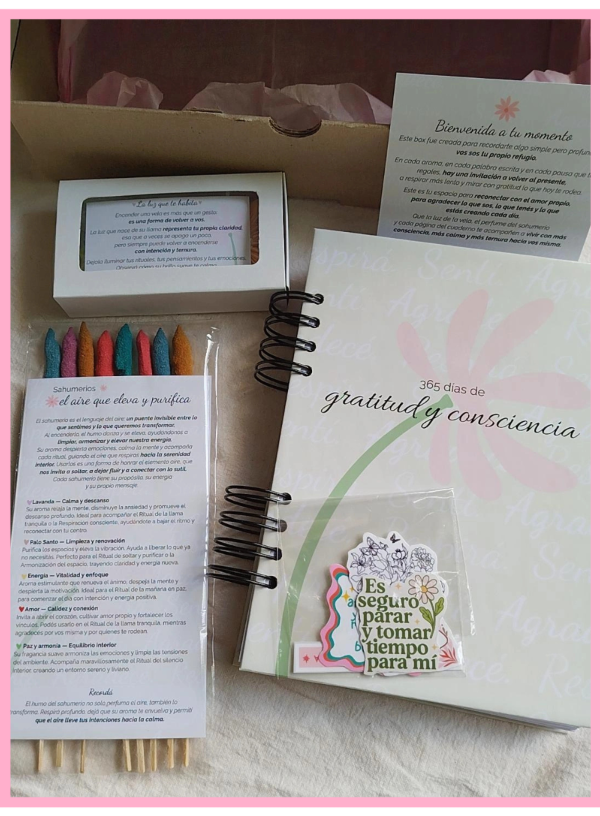 ✨ Esta Box es una experiencia completa de autocuidado, presencia y gratitud, que invita a aprender a ver lo bueno de cada día, cultivar consciencia y conectar con vos misma.